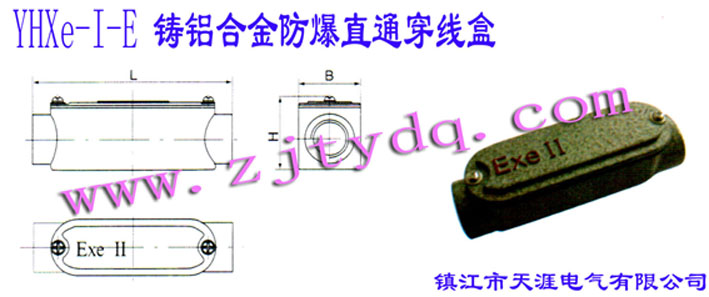 防爆電器 >> 防爆穿線盒 >> YHXe-I-E鑄鋁合金防爆直通穿線盒 AL-alloy Anti-explosion Pull Box of Straight Type 說明: 1、適用范圍: 爆炸性氣體混合物危險場所:1區(qū)、2區(qū) Danger places with gas mixture:Zone 1&2 爆炸性氣體混合物:IIA、IIB、IIC Explosive gas mixture: IIA、IIB、IIC 溫度組別:T1-T6 Temperature group:T1-T6 戶內(nèi)、戶外 indoor,outdoor 2、產(chǎn)品特點: 外殼采用鑄鋁合金,表面噴塑 The closure is made of Cast Aluminum alloy with the surface painting 如需要變徑時可特制 It can be fabricated according to the special requirements 防爆標志:ExeII Explosion-proof Mark:Exe II 防爆等級:IP55 Protection Grad:IP55 結(jié)構(gòu)形式多樣,便于安裝 Many kinds of structures are convenient for installation 3、YHXe防爆穿線盒根據(jù)客戶的要求,在不同的使用場所可選擇一下三種型號:There are three specifications for different purposes 1)、YHXe-I鑄鋁合金防爆穿線盒 YHXe-I Explosion-proof Box of Cast Aluminum Alloy 2)、YHXe-II鑄鐵防爆穿線盒 YHXe-II Explosion-proof Box of Cast Iron Alloy 3)、YHXe-III鑄鋼防爆穿線盒 YHXe-III Explosion-proof Box of Cast Steel Alloy